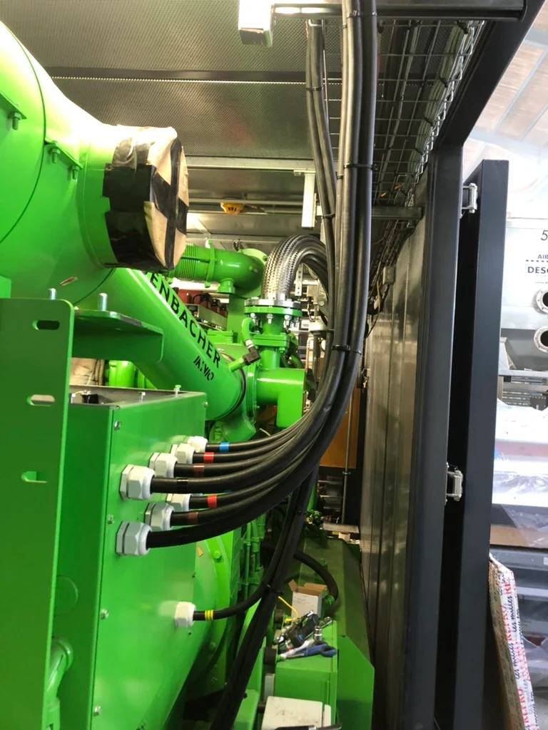 Nous sommes intervenus récemment sur une installation d’un moteur de cogénération située à Agen (47000), équipée d’un moteur Jenbacher 624 d’une puissance de 4,5 MW. L’intervention ne portait pas sur le moteur lui-même, mais sur l’ensemble de ses équipements auxiliaires, indispensables à son fonctionnement stable : pompe de circulation, ventilateur, vannes motorisées et système d’automatisation.